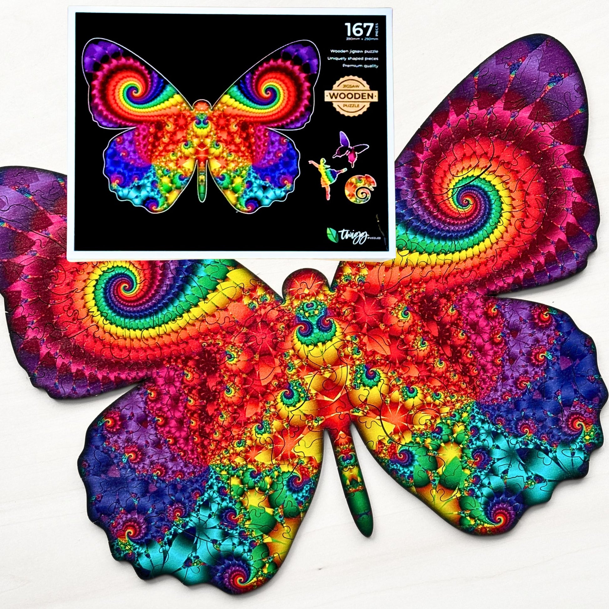 I really enjoy doing Twigg puzzles. I have come to prefer them. The brightly coloured butterfly was a delight to work on though the shape was a bit tricky.